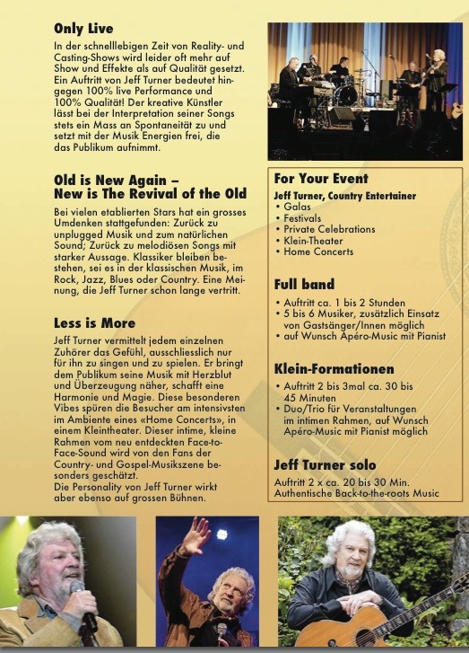When I came to Switzerland from the US, the thing I missed most was my Country music. There were many bands but only one artist was able to stir the real authentic feelings that come from a well sung country song. I am happy to see that Jeff has returned and I for one will be everywhere he plays